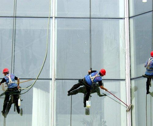 保潔員進行擦玻璃作業時必須帶好安全帶,尤其是高層作業時,要配合高空作業繩,伸縮桿等工具進行操作。